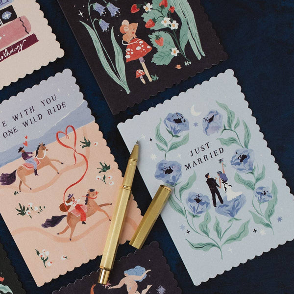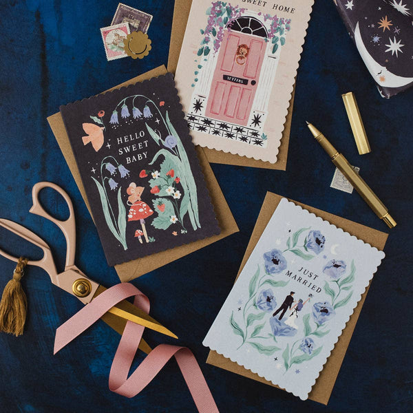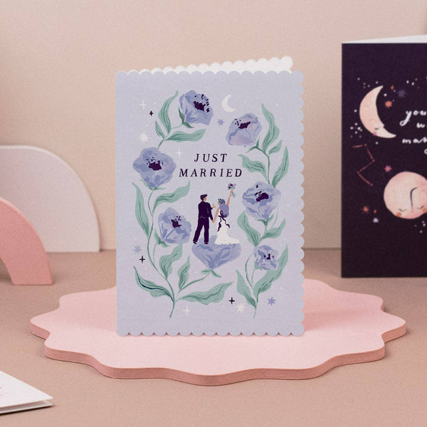 This wedding greeting card congratulates two hearts becoming entwined together forever, as a bride and groom celebrate their nuptials amidst giant blossoms and a 'Just Married' caption. The stunning artwork is full of details, from the bride's polka-dotted accessories to the glint of the diamond ring held by the groom. The gorgeous botanical wedding card symbolises new beginnings, joining families, and the quiet magic of eternal love. The inside is blank, with space for your written messages of joy for the future ahead. Uniquely shaped card 100% recycled kraft envelope Blank inside Luxury, 350gsm card from sustainable forests Illustrated by hand in London Made in the U.K. 100% Recyclable Card Size (WxH): 105 x 150mm / 4 x 6in Packaging options: Biodegradable, clear sleeve or packaging-free with envelope nested inside card. This bride and groom card is part of the wedding card collection from UK based stationery brand Sister Paper Co. Designed to celebrate love that grows, commitment, and all the joyful mom