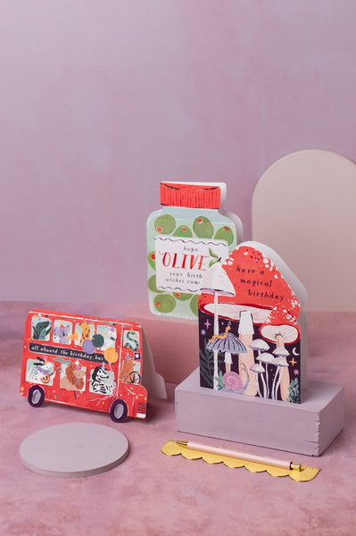 The olive birthday card is blank on the inside, offering your customers plenty of space to pen a birthday message before placing inside the supplied recycled kraft envelope. Both the card and envelope are recyclable and made from papers from certified sustainable forests. This design is part of the UK made collection of uniquely shaped greeting cards.
