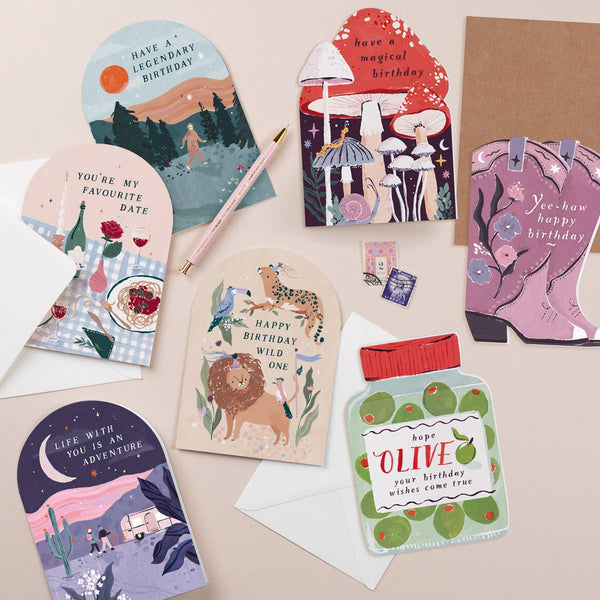 This olives birthday card is the perfect treat for a lover of the briny snack - whether as a garnish in a martini or on a charcuterie board. The uniquely-shaped birthday card is cut into the shape of the olive jar, with the card’s pun caption “hope olive your birthday wishes come true” on the jar label.