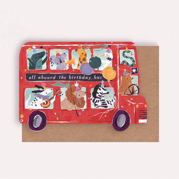Toot Toot! All aboard the birthday bus direct to party central! All the animals have turned up for the big day, with a menagerie of creatures wearing party hats ready to get wild. This kid's birthday card is cut into the shape of a double-decker London red bus, with a bold, colourful, and joy-filled design perfect for animal-loving kids of all genders. Uniquely shaped card 100% recycled kraft envelope Blank inside Luxury, 350gsm card from sustainable forests Illustrated by hand in London Made in the U.K. 100% Recyclable Card Size (WxH): 105 x 150mm / 4 x 6in Packaging options: Biodegradable, clear sleeve or packaging-free with envelope nested inside card. This children’s birthday card is part of a growing collection of kids greeting cards from UK based brand Sister Paper Co, which uses a signature art and lettering style to create a range of memorable paper products for modern shoppers. These unique shaped kids cards are paired with recycled kraft envelopes and are 100% recyclable.