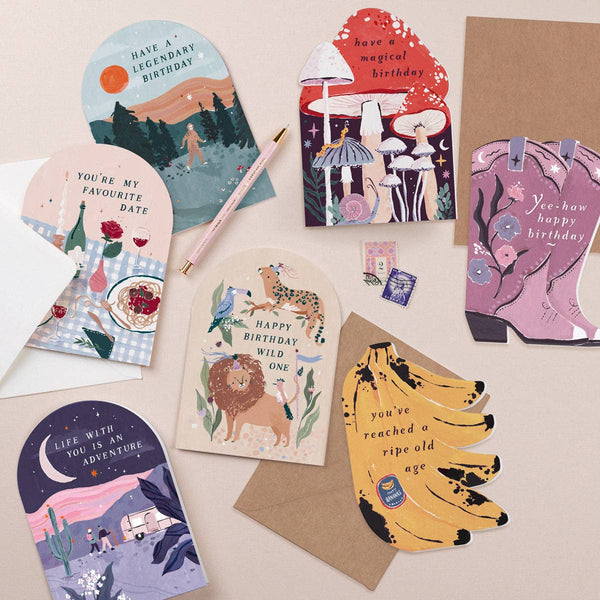 These bananas have seen better days! This banana-shaped birthday card is a cheeky gift to say "you've reached a ripe old age" to a friend or family member with a sense of humour about getting older. The inside of the banana birthday card is blank, with space to share that bananas only get sweeter with age. Uniquely shaped card 100% recycled kraft envelope Blank inside Luxury, 350gsm card from sustainable forests Illustrated by hand in London Made in the U.K. 100% Recyclable Card Size (WxH): 105 x 150mm / 4 x 6in Packaging options: Biodegradable, clear sleeve or packaging-free with envelope nested inside card. These humorous and funny birthday cards have been manufactured in the U.K. using only carefully selected, eco-friendly, sustainably sourced materials by U.K. brand Sister Paper Co. Ideal for gift shops and eco-conscious retailers you can merchandise these funny birthday cards with your other birthday cards, humour cards, greeting cards and birthday cards for men.